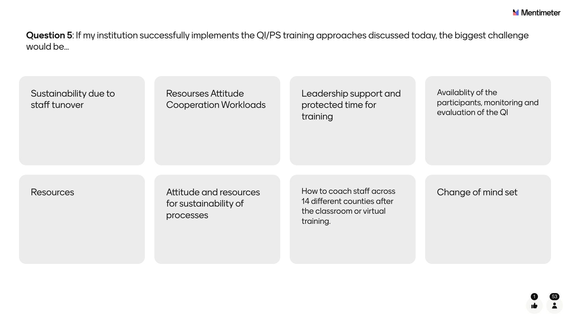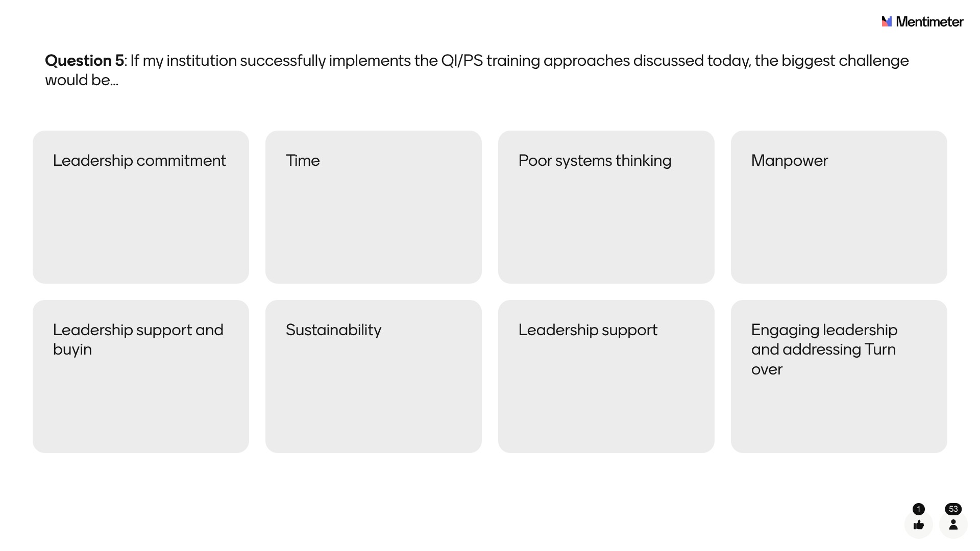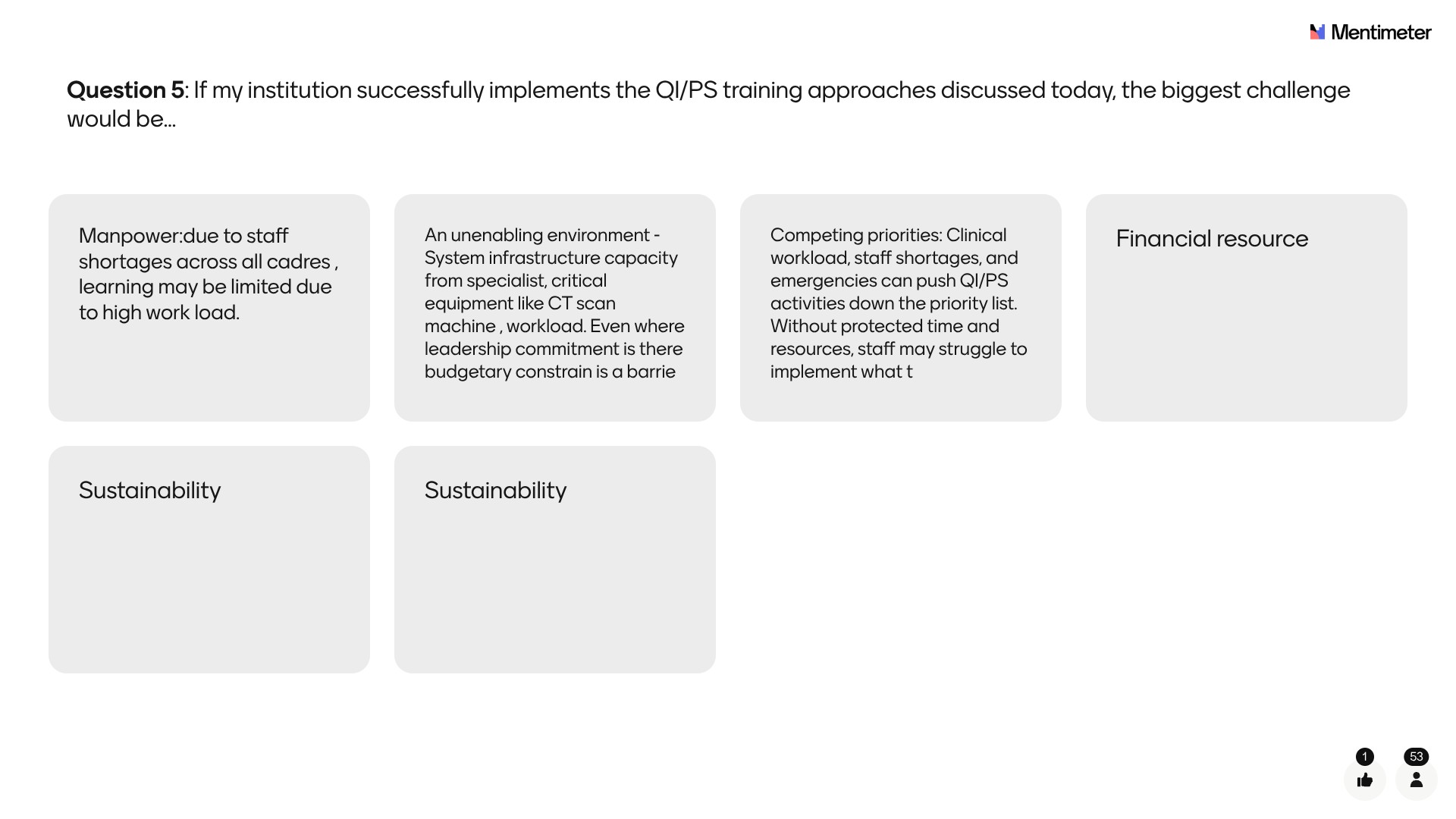 Another key issue raised is the role of supervisors in sustaining improvements. Training frontline workers without the engagement of their supervisors weakens impact, as oversight and support are often absent. Addressing this requires innovative approaches to supervisor engagement, such as modular or bite-sized sessions, integration of quality metrics into supervisory roles, and, critically, the allocation of protected time for QI activities. Without explicit commitments in institutional terms of reference, frontline staff are often denied the time needed to implement what they learn.